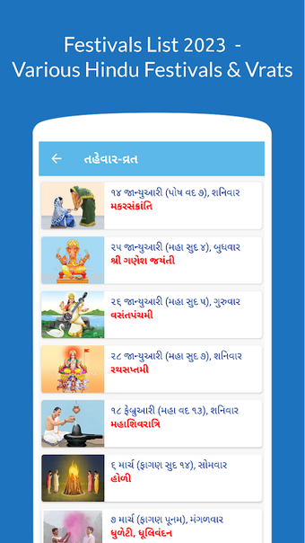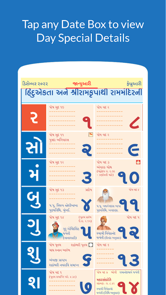 El Calendario Gujarati es una aplicación completamente gratuita. Contiene los detalles de cada día de cada mes y año y ofrece una explicación detallada de los tithis y otros acontecimientos importantes. Contiene artículos sobre el hinduismo, el sistema ayurvédico, la autocuración y otros temas.